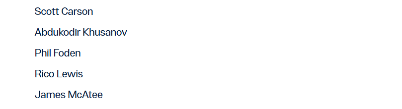 خط الهجوم: فيل فودين، جاك جريليتش، سافينهو، جيرمي دوكو، عمر مرموش، إيرلينج هالاند.