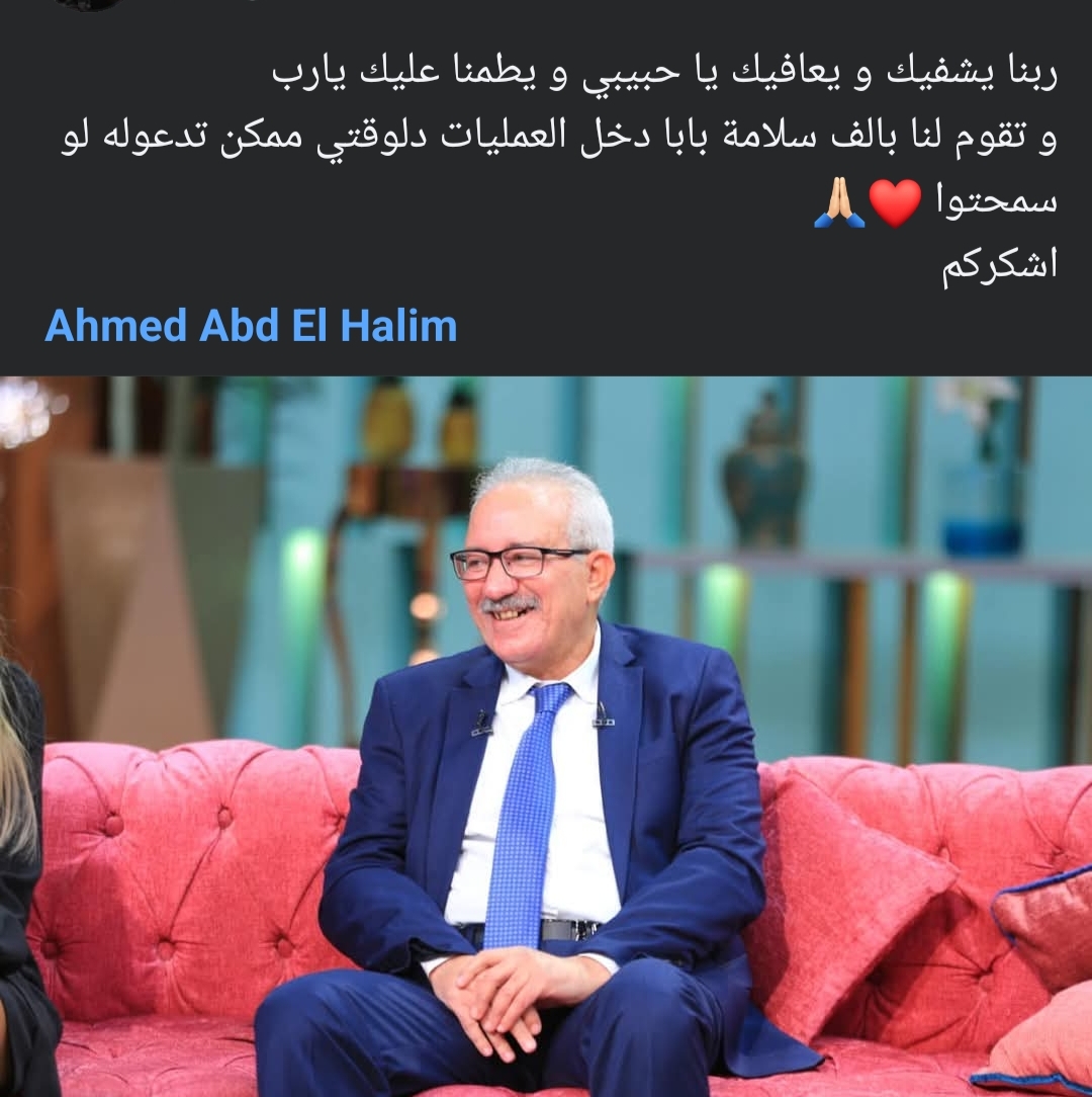 طالبت الفنانة هند عبد الحليم الدعاء إلى والدها الذي تعرض إلى وعكة صحية الساعات الماضية، ونشرت صورة له عبر حسابها الرسمي على موقع التواصل الاجتماعي فيسبوك ووجهت له الدعوات بالشفاء العاجل بعد نقله إلى المستشفى ودخوله غرفة العمليات لإجراء عملية جراحية، وكتبت هند عبد الحليم عبر حسابها على فيسبوك والذي يرصده موقع تحيا مصر: "ربنا يشفيك و يعافيك يا حبيبي و يطمنا عليك يارب وتقوم لنا بالف سلامة بابا دخل العمليات دلوقتي ممكن تدعوله لو سمحتوا"، وانهالت التعليقات على منشورها من نجوم الفن وأصدقائها من خارج الوسط الفني ومتابعيها الذين حرصوا على الاطمئنان على حالة والدها الصحية.