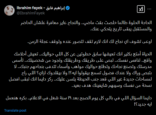 وكتب إبراهيم فايق في رسالة عبر إكس، الحاجة الحلوة طالما خلصت بقت ماضي، والنجاح عايز معافرة علشان الحاضر والمستقبل يبقى تاريخ يتحكي عنك.