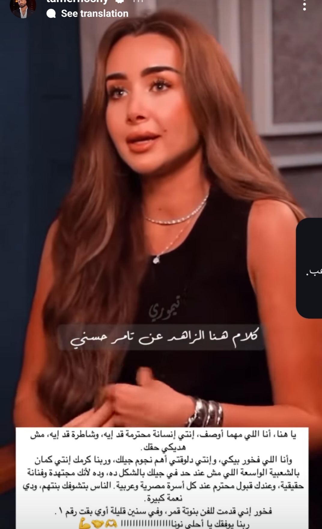 وجه تامر حسني رسالة إلى الفنانة هنا الزاهد بعد إشادة الأخيرة به وعبر عن حبه الشديد لها ولنجاحها ومشوارها الفني المتميز، حيث أنها حصدت شعبية واسعة وصدى ونجاح لأعمالها وهي مازالت في سن صغير، وكتب تامر حسني في رسالته التي يرصدها موقع تحيا مصر: “يا هنا أنا اللي مهما أوصف، إنتي إنسانة محترمة قد إيه، وشاطرة قد إيه، مش هديكي حقك، وأنا اللي فخور بيكي، وإنتي دلوقتي أهم نجوم جيلك، وربنا كرمك إنتي كمان بالشعبية الواسعة اللي مش عند حد في جيلك بالشكل ده، وده لأنك مجتهدة وفنانة حقيقية، وعندك قبول محترم عند كل أسرة مصرية وعربية الناس بتشوفك بنتهم، ودي نعمة كبيرة.. فخور إني قدمت للفن بنوتة قمر ، وفي سنين قليلة أوي بقت رقم، ربنا يوفقك يا أحلى نوناا”.