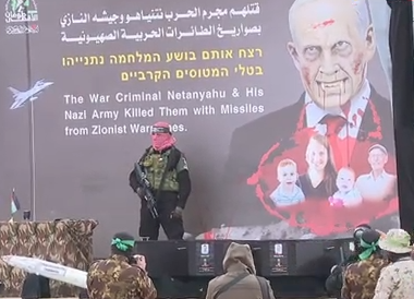 وفي مشهد يتسم بالرمزية والتوتر، أقامت كتائب القسام منصة ضخمة في موقع التسليم تحمل صورة رئيس الوزراء الإسرائيلي بنيامين نتنياهو، مع رسم ملامحه كـ "مصاص دماء" متدفق الدماء من فمه، وهو ما اعتُبر رسالة واضحة تحمل المسؤولية عن مقتل الرهائن.