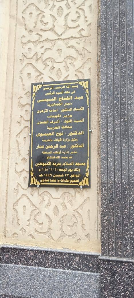 أناب اللواء أشرف الجندي، محافظ الغربية، نائبه الدكتور محمود عيسى لافتتاح مسجد السلام بقرية الأنبوطين التابعة لمركز السنطة، وذلك بعد إعادة بنائه وتوسعته بالكامل بجهود أهل القرية والقُرى المجاورة، ومساهمات أبنائها بالخارج، بتكلفة إجمالية بلغت 13 مليون جنيه، ليصبح صرحًا دينيًا متكاملًا يخدم أبناء القرية ، بحضور اعضاء مجلسي النواب والشيوخ ، الشيخ خالد خضر نائبا عن وزير الاوقاف ، الشيخ نوح العيسوي وكيل وزارة الاوقاف بالغربية.