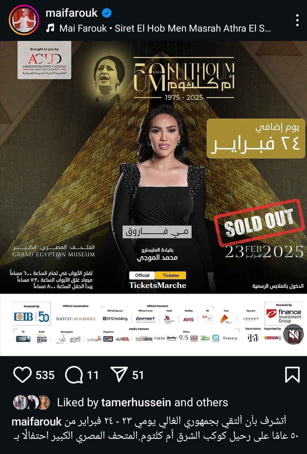 تستعد الفنانة مي فاروق لإحياء حفل غنائي ضخم الليلة وغدًا في المتحف المصري الكبير إحياءً لذكرى كوكب الشرق أم كلثوم، وكانت شاركت مي فاروق البوستر الدعائي الخاص بالحفل عبر حسابها الرسمي على موقع تبادل الصور والفيديوهات انستجرام وعلقت عليه محمسة الجمهور له، وقالت: "أتشرف بأن ألتقي جمهوري الغالي يومي 23 و 24 فبراير في المتحف المصري الكبير احتفالًا بمرور 50 عامًا على رحيل كوكب الشرق أم كلثوم"، علق عدد كبير من جمهور مي فاروق ومحبين صوتها المتميز على منشورها معبرين عن حماسهم للحفل ومن المقرر أن تقدم مي فاروق خلال الحفل باقة من أجمل أغاني أم كلثوم التي تعاونت فيها مع كبار الملحنين ومازالت مستمرة معنا حتى الآن رغم اختلاف الأذواق والأجيال، ومن المتوقع أن يشهد الحفل حضور ضخم وخاصةً محبي كوكب الشرق وصوت مي فاروق وحضورها المميز على المسرح.