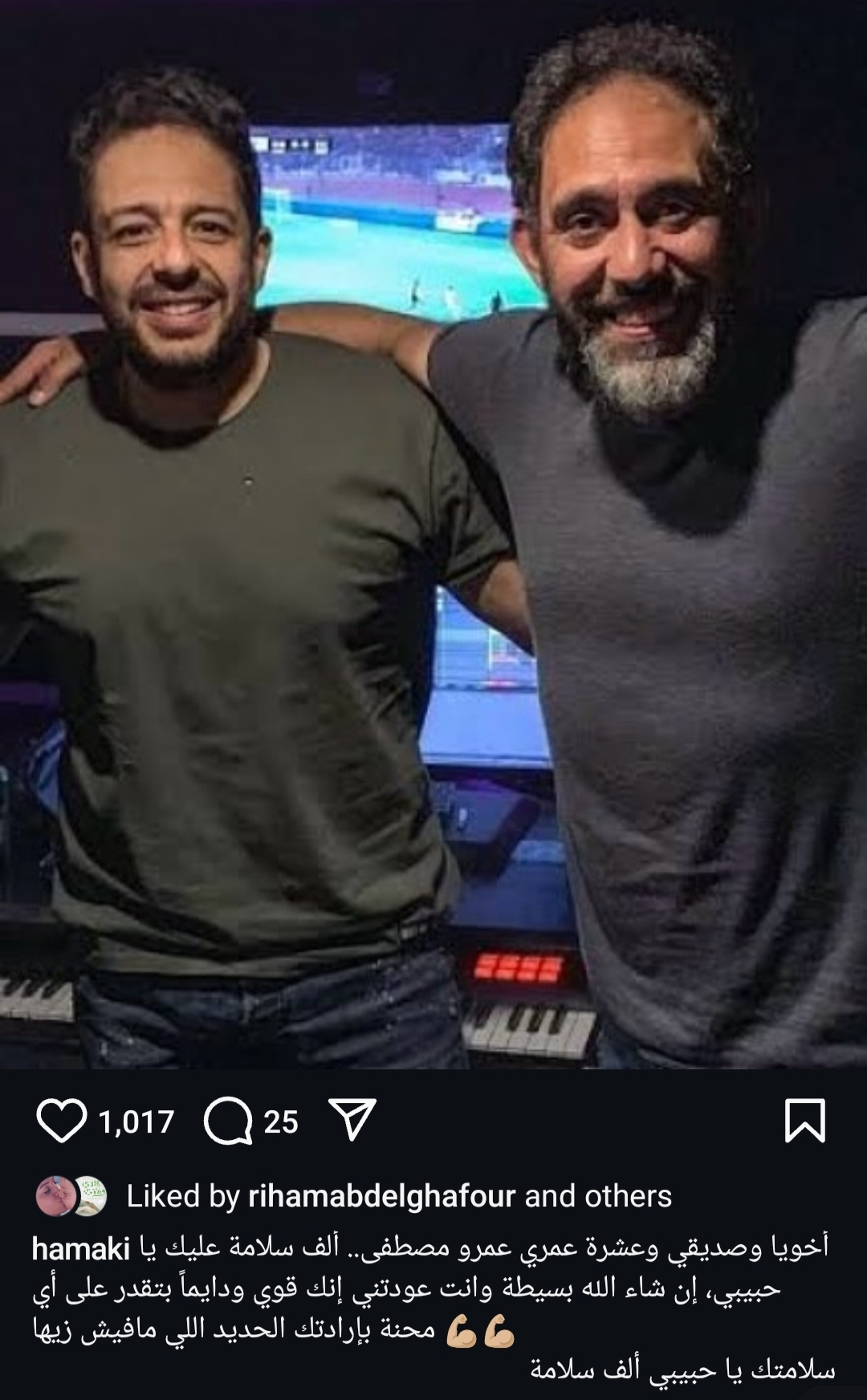 نشر المطرب محمد حماقي صورة تجمعه بالفنان عمرو مصطفى عبر حسابه الرسمي على موقع تبادل الصور والفيديوهات انستجرام يرصدها موقع تحيا مصر، وعلق عليها موجهًا له رسالة دعم مؤثرة تعبر عن حبه الشديد له وصداقتهما القوية، وكتب حماقي: “أخويا وصديقي وعشرة عمري.. ألف سلامة عليك يا حبيبي إن شاء الله بسيطة وانت عودتني إنك قوي وبتقدر على أي محنة بإرادتك الحديد اللي مافيش زيها.. سلامتك يا حبيبي ألف سلامة”، ومن جانبه حرص أيضًا المؤلف أمير طعيمة على دعم عمرو مصطفى وكتب عبر حسابه على انستجرام: “أخويا الغالي وعشرة العمر و اللي بينا أغاني و نجاحات معرفش عددها، ألف سلامة عليك يا مرمر و ربنا يتمم شفاك على خير بإذن الله”.