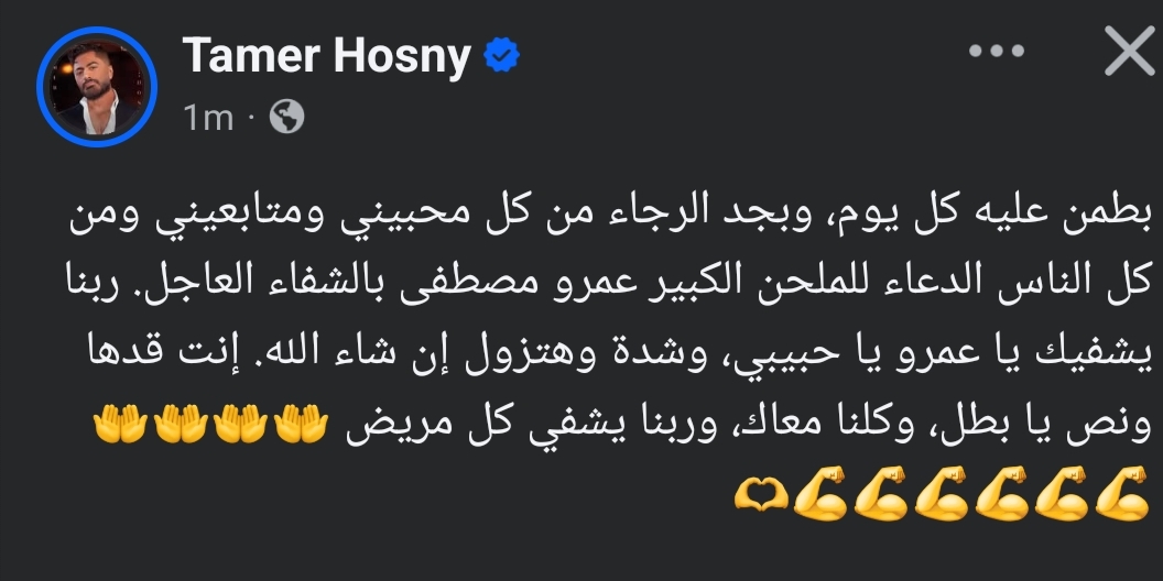 شارك الفنان تامر حسني منشور يرصده موقع تحيا مصر عبر حسابه الرسمي على موقع التواصل الاجتماعي فيسبوك كشف من خلاله تواجده الدائم إلى جانب عمرو مصطفى وحرصه على الاطمئنان عليه وذلك رغم الخلافات بينهما المستمرة منذ سنوات طويلة، كما طالب تامر حسني من جمهوره الدعاء للفنان عمرو مصطفى بالشفاء العاجل بعد انتشار خبر إصابته بالسرطان وخضوعه لعملية استئصال ورم خبيث، وكتب تامر حسني: “بطمن عليه كل يوم، وبجد الرجاء من كل محبيني ومتابعيني ومن كل الناس الدعاء للملحن الكبير عمرو مصطفى بالشفاء العاجل. ربنا يشفيك يا عمرو يا حبيبي، وشدة وهتزول إن شاء الله. إنت قدها ونص يا بطل، وكلنا معاك، وربنا يشفي كل مريض”.