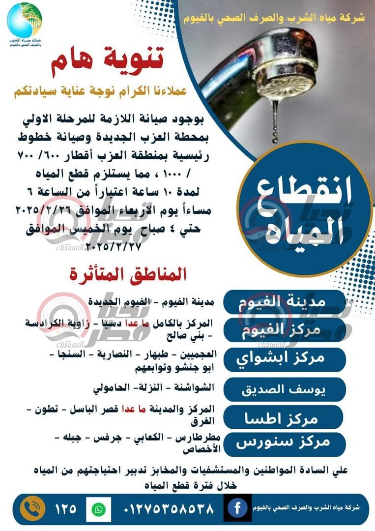 مياه الفيوم.. قطع المياه عن 6 مناطق لمدة 10ساعة