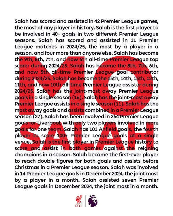 وجاء في بيان الحساب الرسمي للبريميرليج عن محمد صلاح، سجل صلاح وصنع في 42 مباراة بالدوري الإنجليزي الممتاز، وهو أكبر عدد من الأهداف مقارنة بأي لاعب آخر في التاريخ.، صلاح هو أول لاعب يشارك في أكثر من 40 هدفًا في موسمين مختلفين من الدوري الإنجليزي الممتاز.