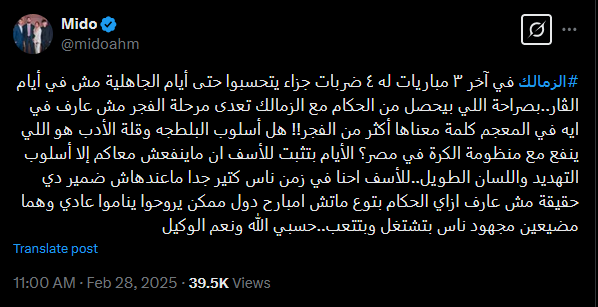 وكتب أحمد حسام ميدو في رسالة عبر إكس، الزمالك في آخر ٣ مباريات له ٤ ضربات جزاء يتحسبوا حتى أيام الجاهلية مش في أيام الڤار، بصراحة اللي بيحصل من الحكام مع الزمالك تعدى مرحلة الفجر مش عارف في أيه في المعجم كلمة معناها أكثر من الفجر.