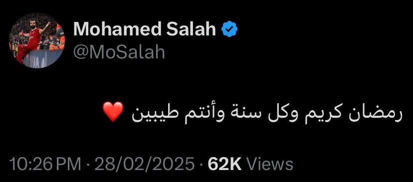 وكتب محمد صلاح في رسالة عبر "إكس" رمضان كريم وكل سنة وأنتم طيبين".