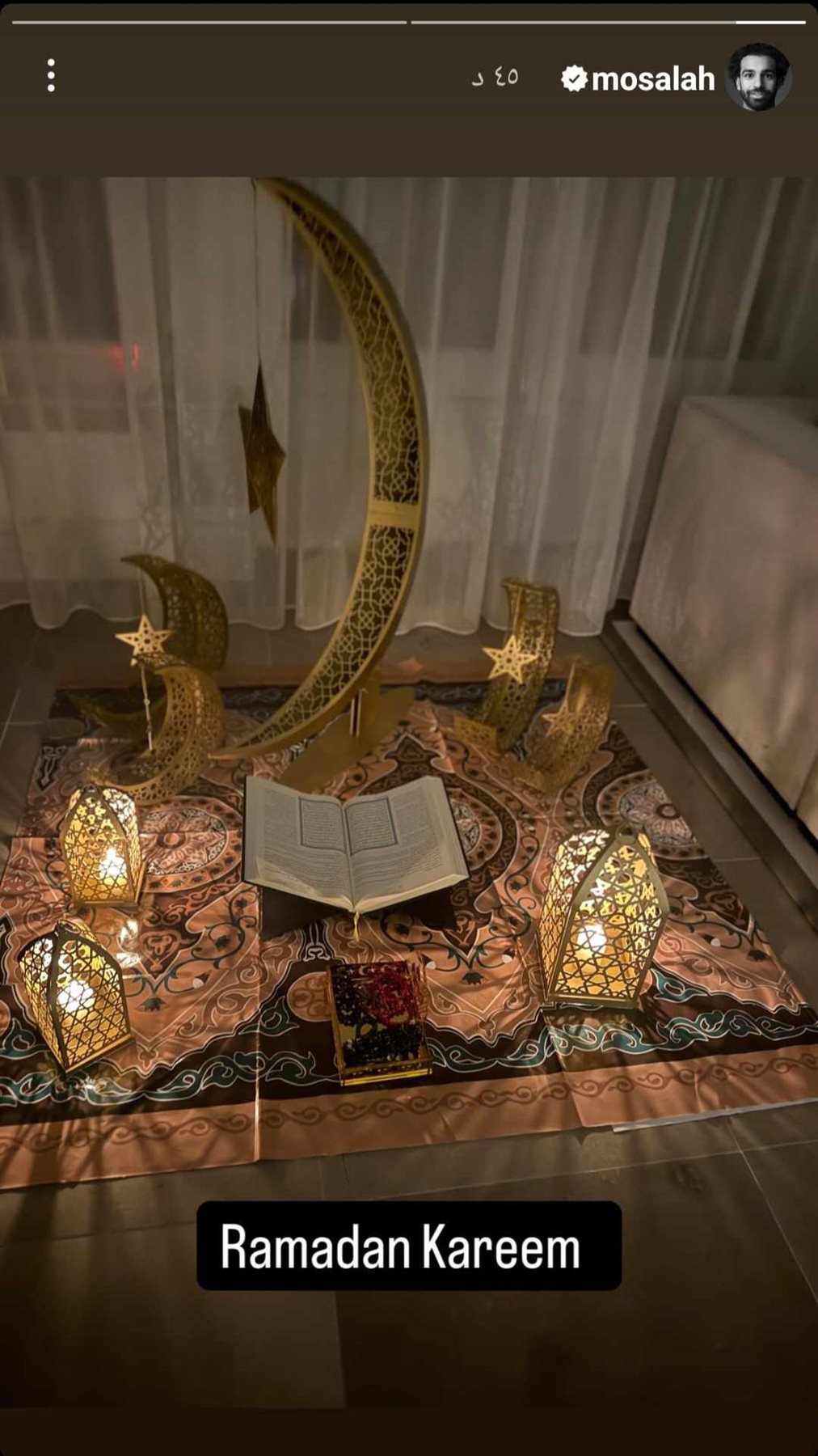 وقام محمد صلاح بتعليق زينة رمضان داخل منزلة، كما نشر صورة للمصحف وسجادة وأشكال الهلال والنجوم والمصابيح.