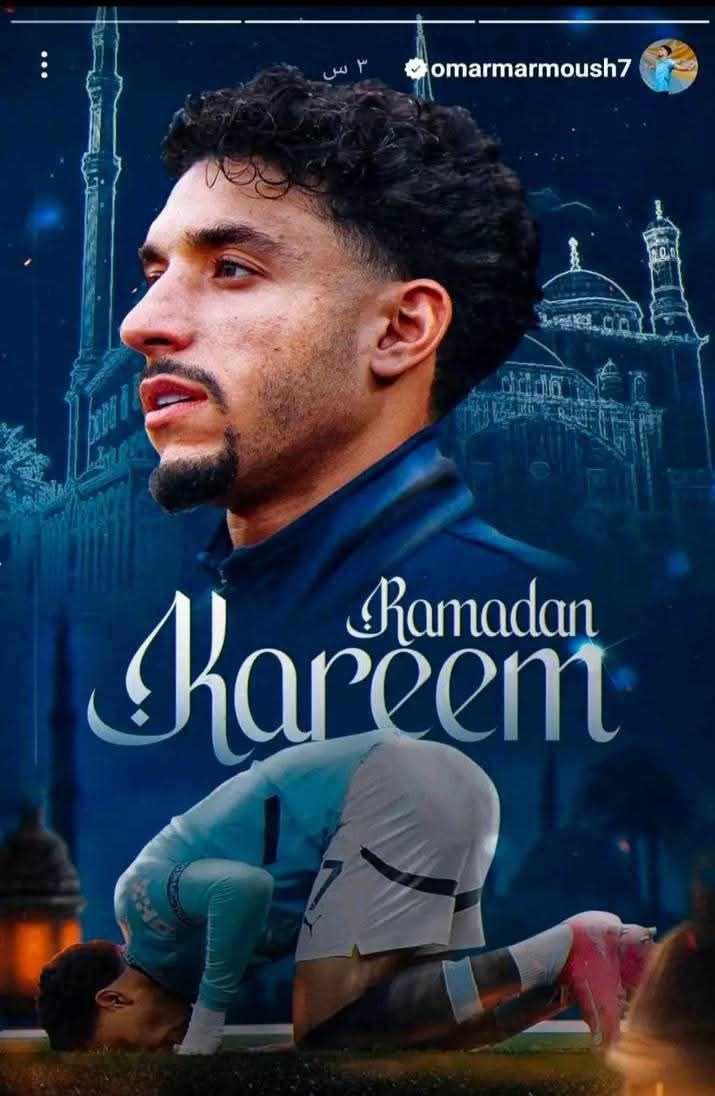 ونشر عمر مرموش صورة عبر ستوري انستجرام بقميص فريق مانشستر سيتي وصورة آخرى وهو ساجد وكتب "رمضان مبارك".