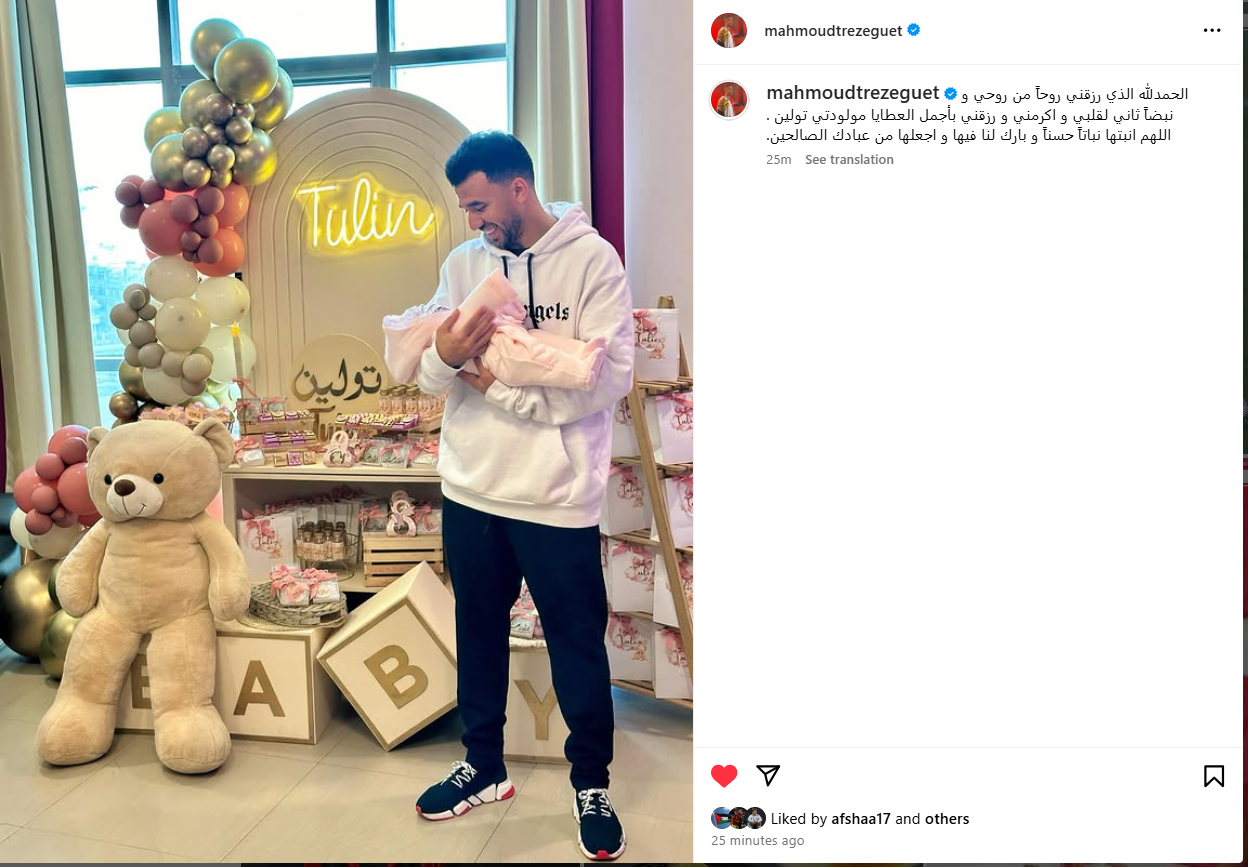 عبر محمود حسن تريزيجيه لاعب الريان القطري ومنتخب مصر، عن سعادته بعدما رزق بمولودته"تولين".