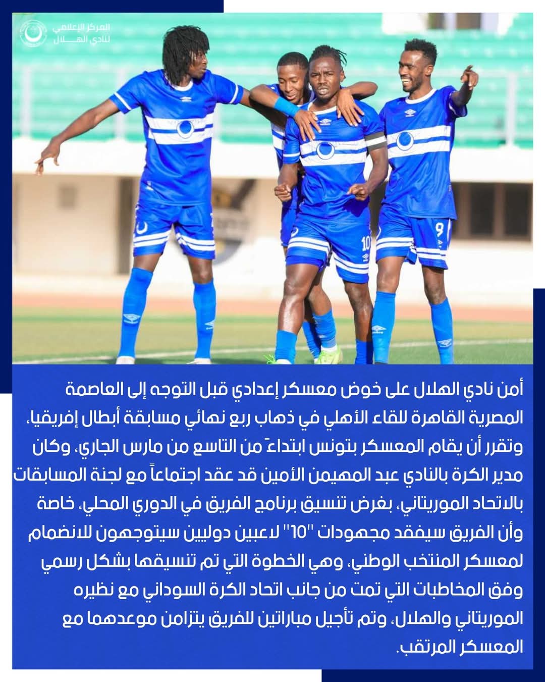 أمن نادي الهلال على خوض معسكر إعدادي قبل التوجه إلى العاصمة المصرية القاهرة للقاء الأهلي في ذهاب ربع نهائي مسابقة أبطال إفريقيا، وتقرر أن يقام المعسكر بتونس ابتداء من التاسع من مارس الجاري.