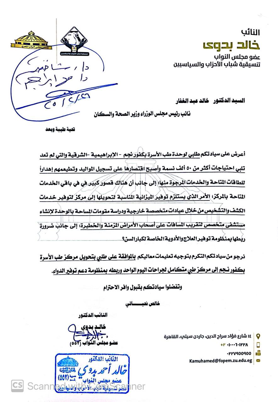 خالد بدوي يتقدم بطلب إلي وزير الصحة لتحويل وحدة طب الأسرة بكفور نجم بالإبراهيمية إلي مركز طبي متكامل لجراحات اليوم الواحد