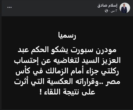 وقال إسلام صادق عبر فيسبوك، مودرن سبورت يشكو الحكم عبد العزيز السيد لتغاضيه عن احتساب ركلتي جزاء أمام الزمالك في كأس مصر.