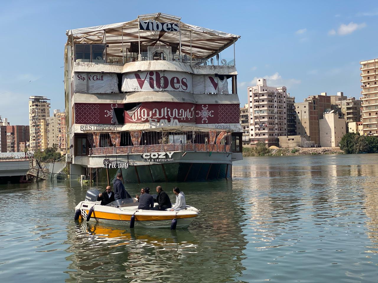 وصدر بيان لمحافظة الدقهلية : «تعرضت أحد المراكب العائمة بالنيل بمدينة المنصورة بالمشاية السفلية لميل وغمر الدور الأول بمياه النيل، نتيجة تسرب المياه بالطابق الأرضي».