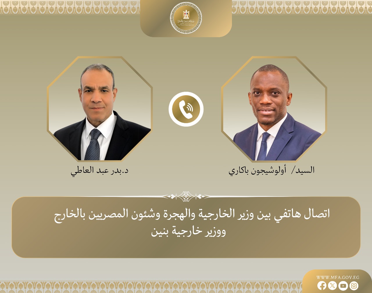 أكد د. بدر عبد العاطي وزير الخارجية والهجرة على التزام مصر بدعم جهود التنمية في بنين و توسيع آفاق التعاون الاقتصادي وتبادل الخبرات الفنية، وجاء ذلك خلال مكالمة هاتفية تلقاها، اليوم السبت، من أولوشيجون باكاري، وزير خارجية جمهورية بنين.