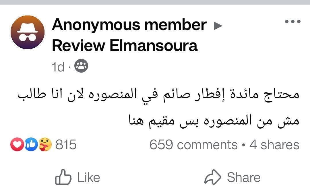 سأل طالب العلم يقول: محتاج مائدة إفطار صائم في المنصورة، لإن أنا طالب مش من المنصورة"، وبمجرد أن نشر الطالب السؤال تلقى سيلا من الردود، يطلب أصحابها التواصل معه لإحضار وجبة الإفطار إليه.