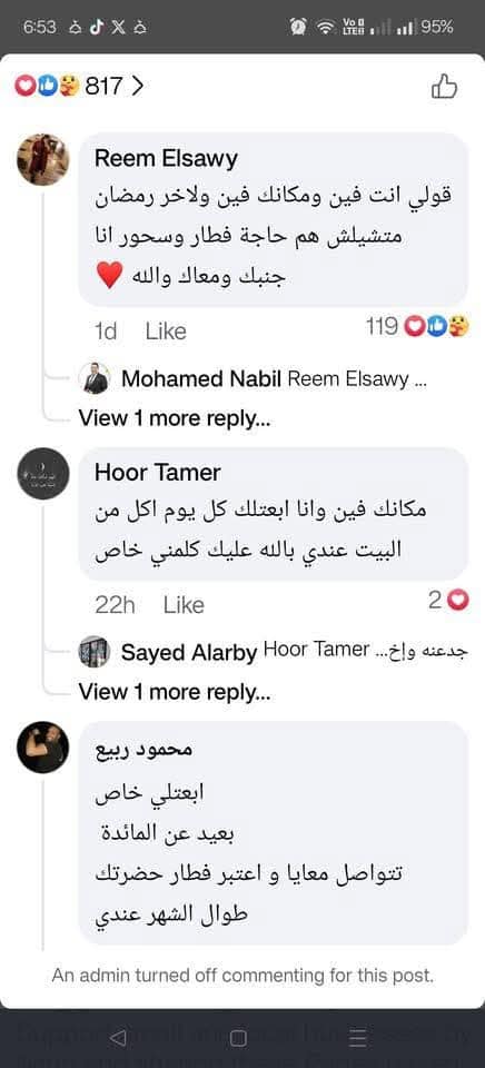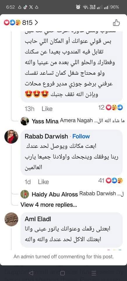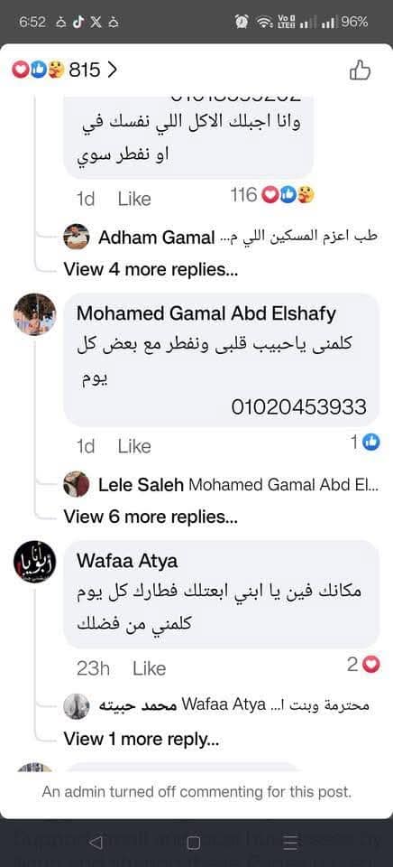 وعلقت رباب درويش قائلة: " ابعت مكانك ويوصل لحد عندك، ربنا يوفقك وينجحك، وأولادنا جميعا يارب العالمين" ةعلقت أمل العادي قائلة: " ابعت رقمك وعنوانك يا نور عيني وأنا أبعت لك الأكل لحد عندك والله.. والله".