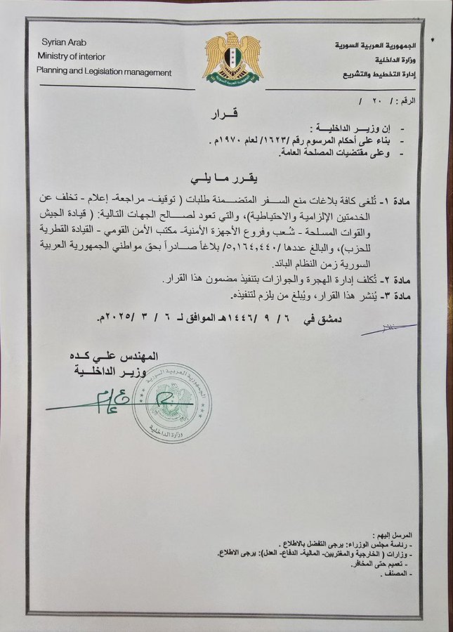وذكرت وزارة الداخلية في بيان لها تم إلغاء جميع بلاغات منع السفر (توقيف- مراجعة- إعلام - تخلف عن الخدمتين الإلزامية والاحتياطية) الصادرة بحق المواطنين السوريين في عهد نظام بشار الأسد.