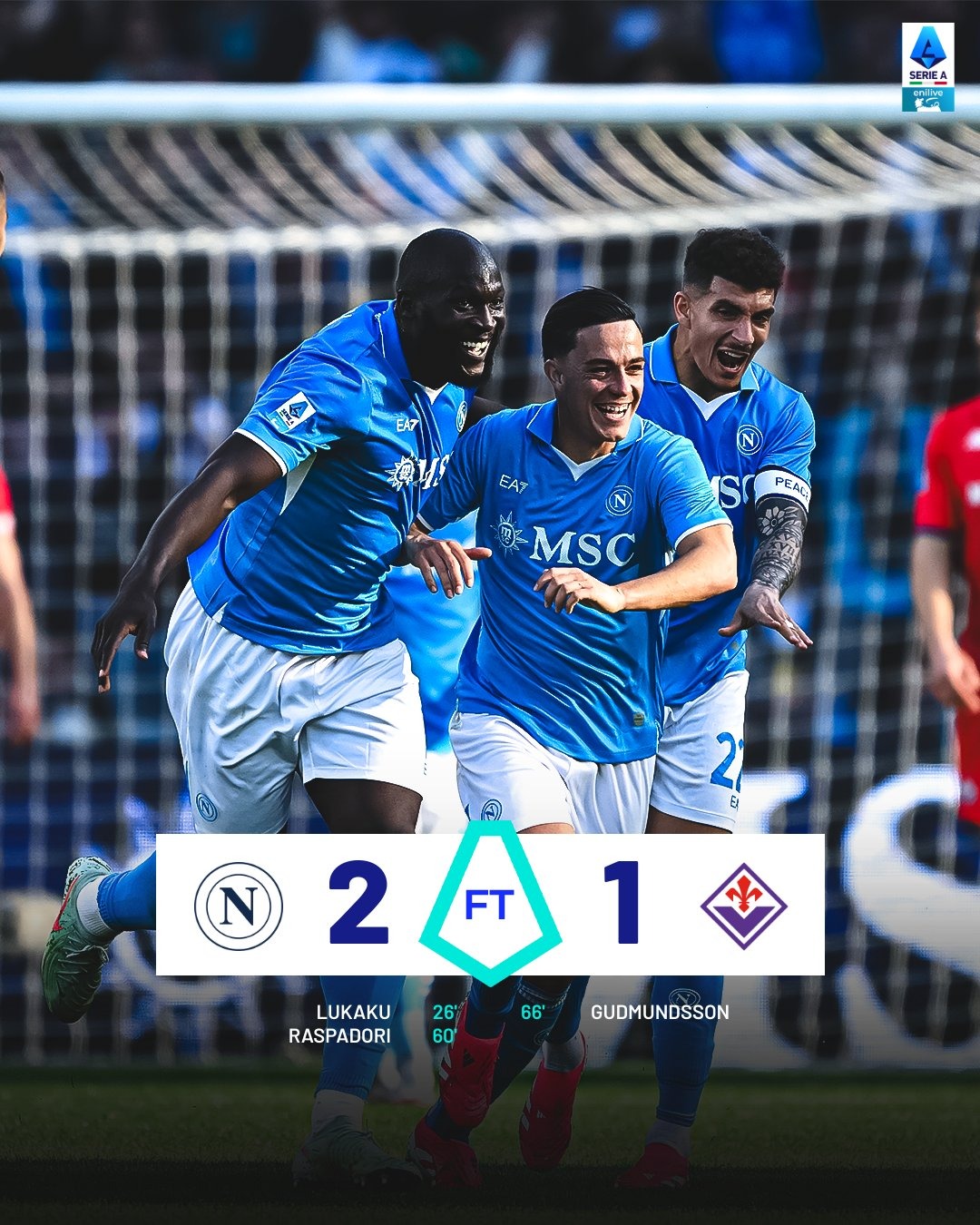 وفي الدقيقة 60 عاد فريق نابولي ليُضيف الهدف الثاني عن طريق راسبادوري بتسديدة على يسار الحارس دي خيا، بعد تمريرة مميزة من زميله لوكاكو، لتصبح النتيجة (2-0) أمام فريق فيورنتينا.