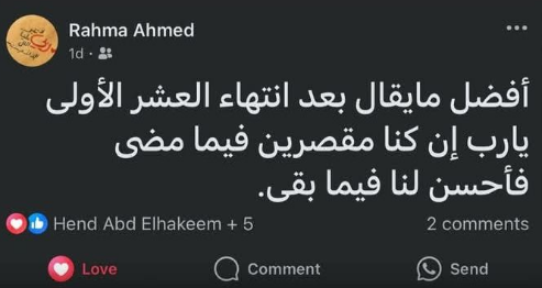 وأثار منشور كتبته طالبة آداب جامعة أسيوط قبل وفاتها بأزمة قلبية، كان هو الأخير لها قبل رحيلها، يتضمن “أفضل ما يقال بعد إنتهاء العشر الأولى يا رب إن كنا مقصرين فيما مضى، فأحسن لنا فيما بقى”.