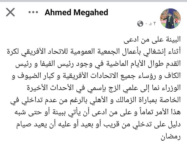 وكتب أحمد مجاهد على فيسبوك، البينة على من ادعى، أثناء إنشغالي بأعمال الجمعية العمومية للاتحاد الأفريقي لكرة القدم طوال الأيام الماضية في وجود رئيس الفيفا ورئيس الكاف ورؤساء جميع الاتحادات الأفريقية وكبار الضيوف و الوزراء.
