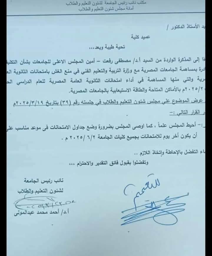 وأكدت اول جامعة موافقتها على عقد امتحانات الثانوية العامة داخل الجامعات هى جامعة أسيوط حيث كشف اول مستند رسمى صادر من الدكتور أحمد عبد المولى نائب رئيس جامعة أسيوط لشئون التعليم والطلاب لعمداء الكليات، عن موافقة الجامعة على المذكرة الواردة من الدكتور مصطفى رفعت أمين المجلس الأعلى للجامعات، بشأن التكليف بمساهمة الجامعات المصرية مع وزارة التربية والتعليم والتعليم الفنى فى منع الغش بامتحانات الثانوية العامة المصرية والتى منها المساهمة فى أداء امتحانات الثانوية العامة للعام الدراسى 2025 بالأماكن المتاحة والطاقة الاستيعابية بالجامعات المصرية .