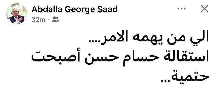 وكتب عبد الله جورج في رسالته، إلى من يهمة الأمر، استقالة حسام حسن من تدريب منتخب مصر أصبحت حتمية.