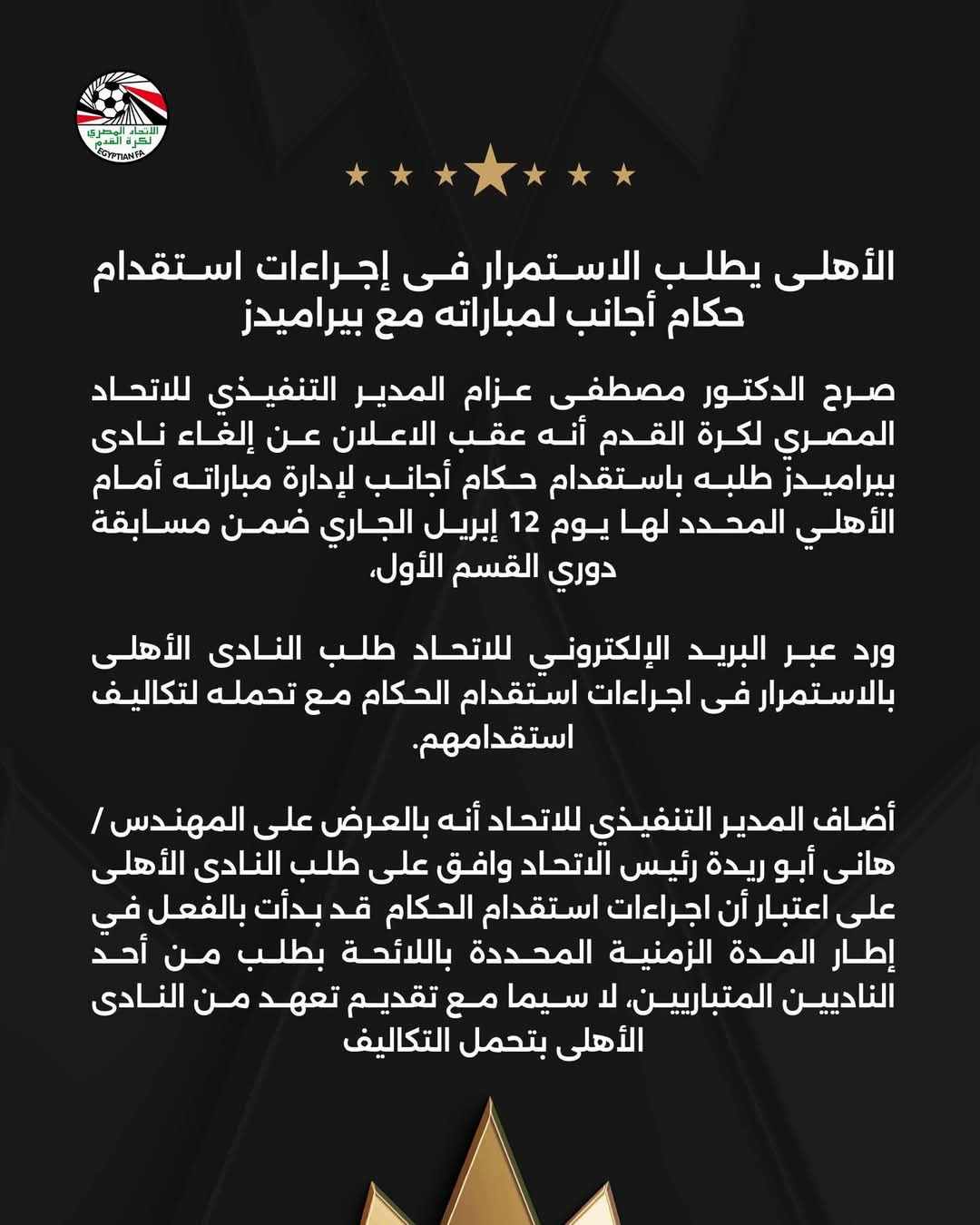 وكان نادي بيراميدز، قد قدم طلباً رسمياً للاتحاد المصري لكرة القدم يتضمن رغبته في استقدام طاقم تحكيم أجنبي لإدارته مباراته أمام الأهلي المقرر إقامتها يوم 12 إبريل المقبل ضمن الجولة الثانية للدور الثاني لمسابقة دوري القسم الأول، وقرر الاتحاد المصري اتخاذ الاجراءات الواجبة في هذا الصدد بعد أن استوفي طلب نادي بيراميدز الشروط المنصوص عليها لائحياً، وتعهده بسداد تكاليف استقدام الطاقم الأجنبي فور انتهاء اجازة البنوك بمناسبة عيد الفطر المبارك.
