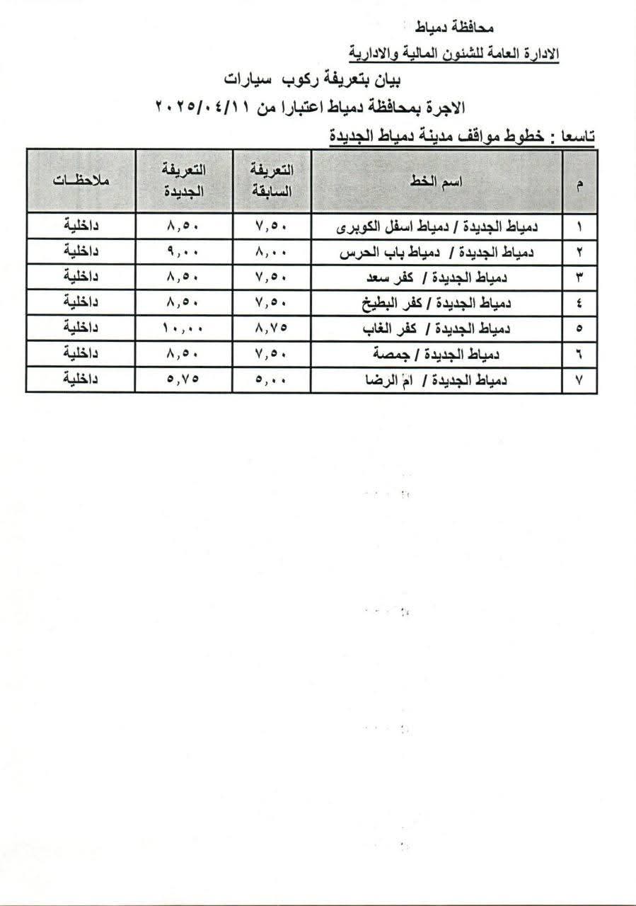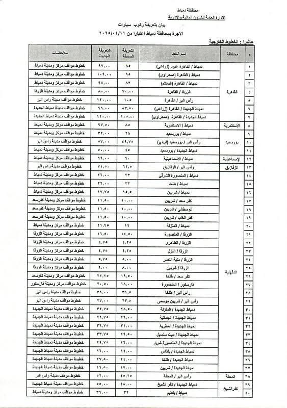 اعتمد الدكتور أيمن الشهابى محافظ دمياط، تعديل تعريفة الركوب لسيارات الأجرة بنطاق المحافظة، وفقًا لما هو موضح بالجداول المرفقة ، كما إعتمد تعديل تعريفة الركوب لسيارات التاكسي وذلك بفتح العداد الكيلو الأول من ١٠ جنيه إلى ١١.٥ جنيه والكيلو الذى يليه من ٣ جنيه إلى ٣.٤٥ جنيه ، وذلك عقب قرار لجنة التسعير التلقائي بتحريك أسعار المواد البترولية اعتبارًا من اليوم .