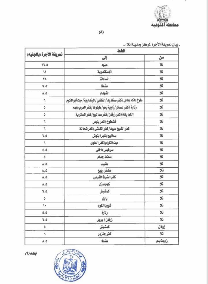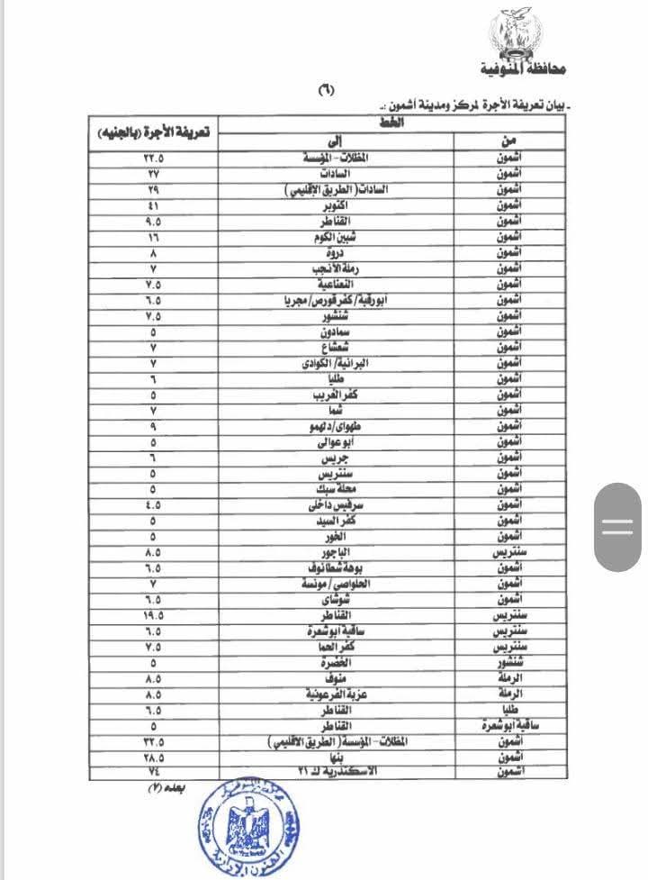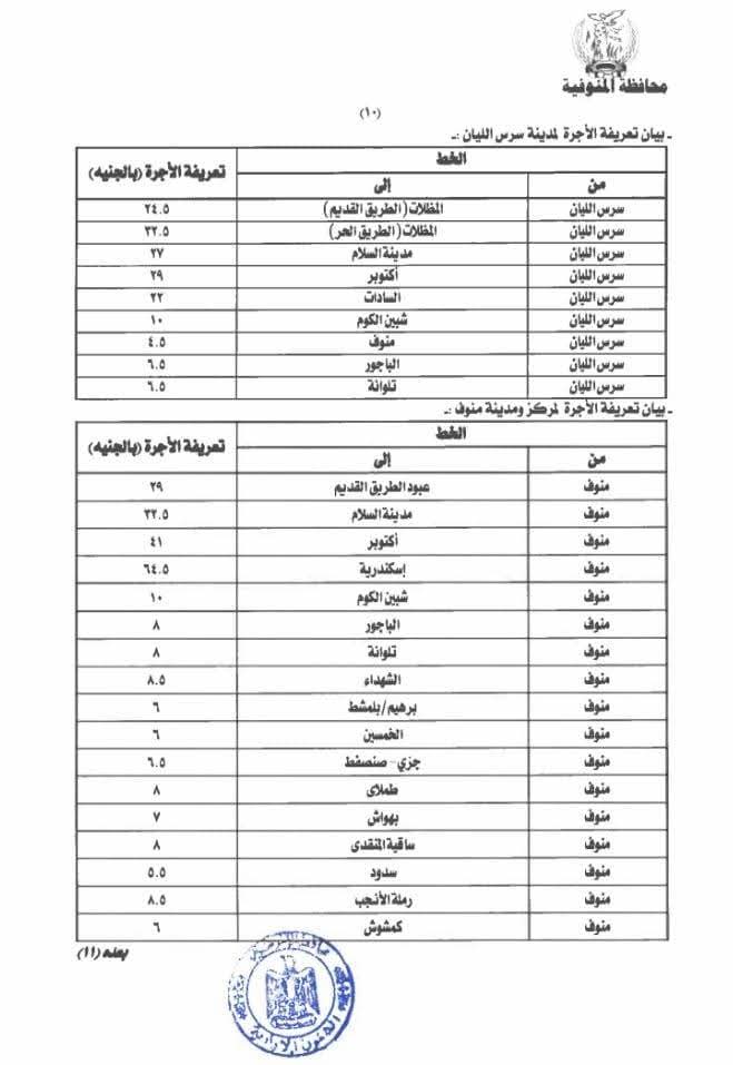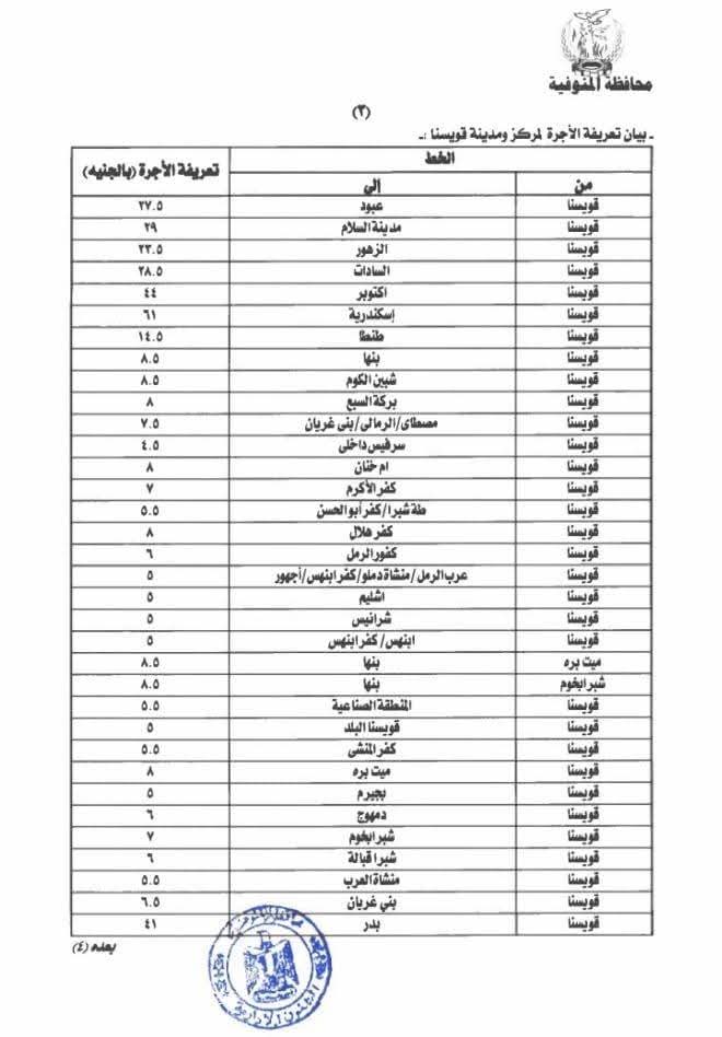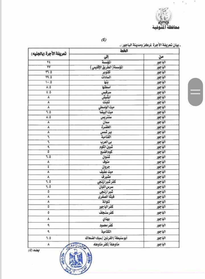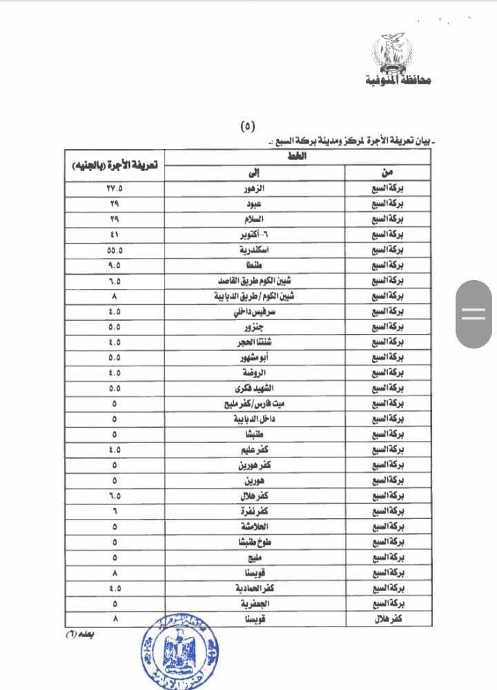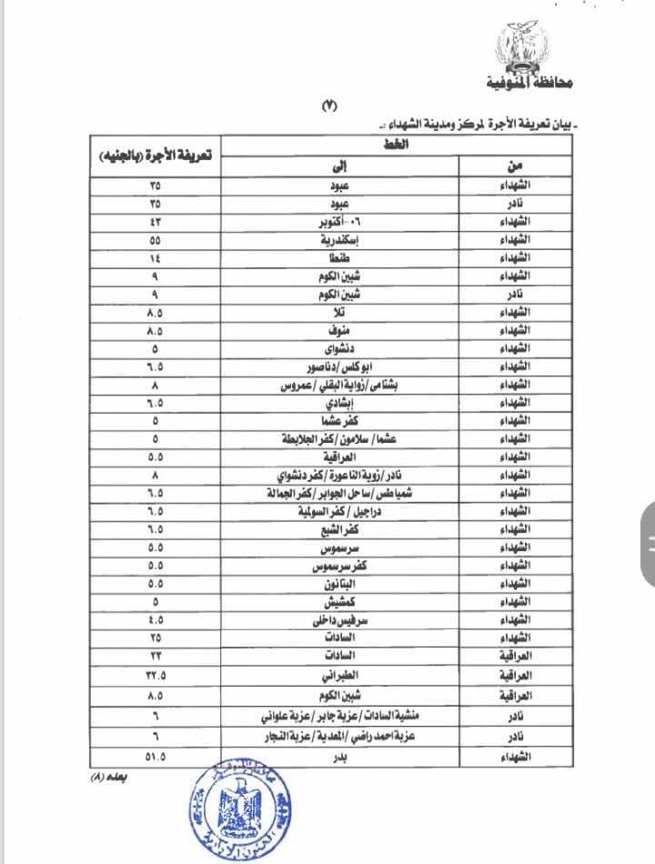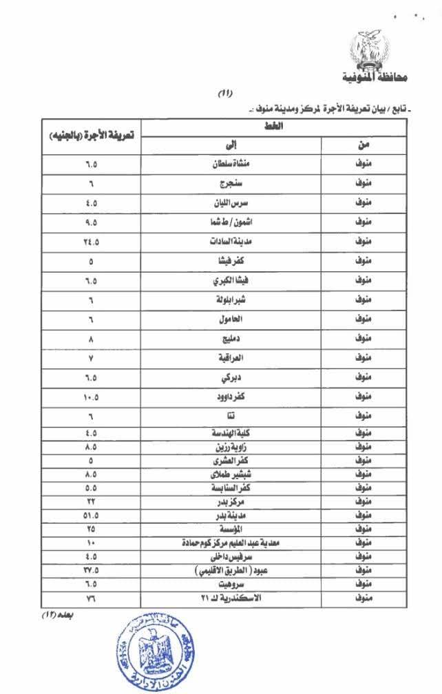 عقب قرار لجنة التسعير التلقائي للمنتجات البترولية وزيادة أسعار البنزين والسولار بما يقارب جنيهان لكل لتر وذلك اعتبارا من اليوم الجمعة 11 إبـريـل 2025، أصدر اليوم اللواء إبراهيم أبو ليمون محافظ المنوفية قرار رقم ( 514 ) لسنة 2025 بشأن تعديل التعريفة الجديدة والمقررة لركوب كافة مركبات الأجرة بدائرة المحافظة.