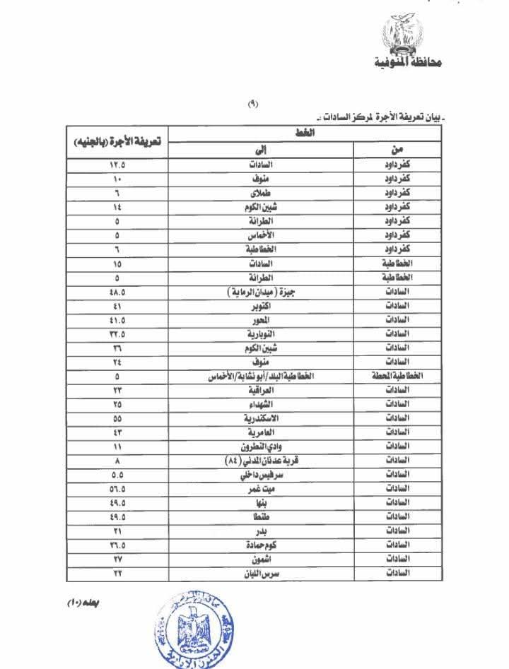 هذا وتضمنت المادة الثانية من القرار تعديل تعريفة ركوب تاكسي الأجرة 12 جنيه على أساس محاسبة العداد من بداية فتح البنديرة ومبلغ 3,50 جنيه عن كل 1 كيلو متر من المسافة المقطوعة ، و 13 جنيه تعريفة الركوب الجديدة لمركبات التوكتوك داخل قري المحافظة ، و 12 جنيه تعريفة ركوب المركبات الخفيفة ( سيارة بديل التوكتوك ) .