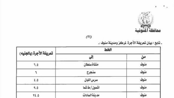 أسعار تعريفة الركوب الجديدة لسيارات الأجرة والتاكسي بالخطوط الداخلية والخارجية فى المنوفية