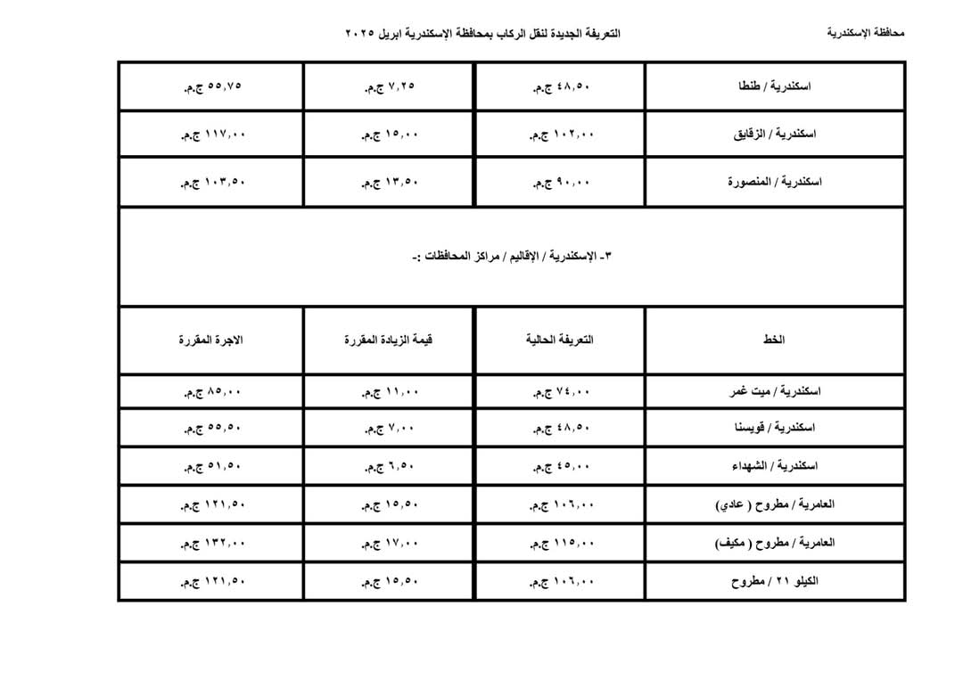 محافظة الإسكندرية تعتمد تعريفة الركوب الجديدة لوسائل النقل بعد الزيادة الجديدة