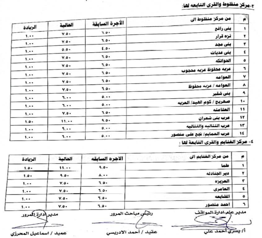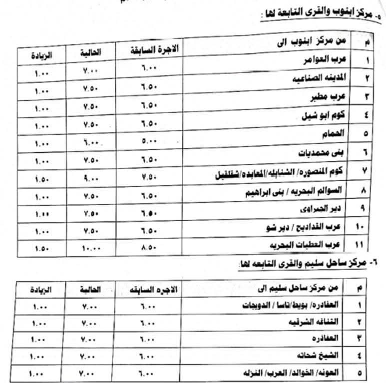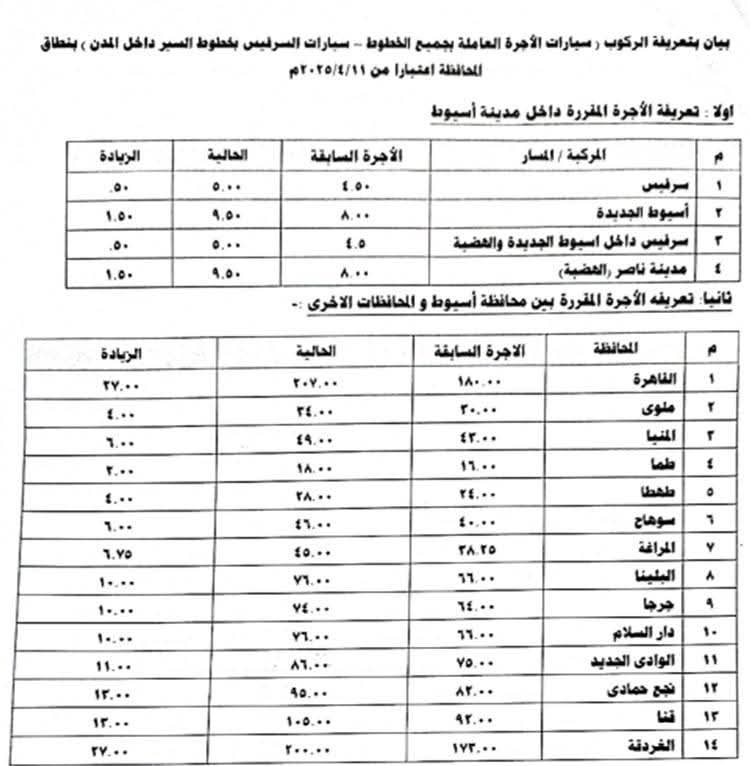 ونص القرار الصادر على تعديل الأجرة المقررة لسيارات التاكسي لتصبح 15 جنيهًا والسيرفيس داخل مدينة أسيوط 5 جنيهات و9.5 جنيها لمدينة أسيوط الجديدة و 9.5 جنيهات لمدينة ناصر الجديدة والسرفيس داخل مدينتي أسيوط الجديدة وناصر الجديدة 5 جنيهات بالإضافة إلى زيادة الأجرة بين مدينة أسيوط ومراكزها لتصبح 25 جنيها لديروط و19 جنيها للقوصية و11 جنيها لمنفلوط و11 جنيها لأبوتيج و15.5 جنيها لصدفا و20 جنيها للغنايم و11 جنيها لساحل سليم و15.5 جنيها للبدارى و8.5 جنيهًا لأبنوب و4.5 جنيهًا للفتح.