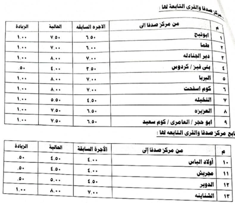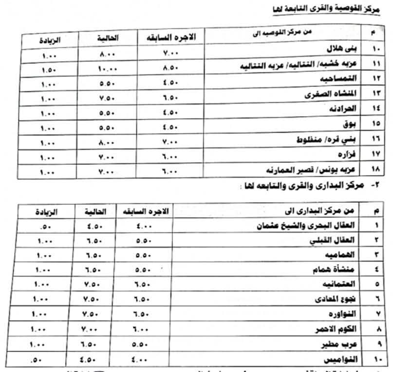 أما تعريفة الأجرة المقررة بين محافظة أسيوط والمحافظات الأخرى فأصبحت 207 جنيهاً لمحافظة القاهرة و34 جنيهاً لملوي و49 جنيهاً للمنيا و18 جنيهاً لطما و28 جنيهاً لطهطا و46 جنيهاً لسوهاج و45 جنيهًا للمراغة و76 جنيهاً للبلينا و74 جنيهاً لجرجا و76 جنيهًا لدار السلام و86 جنيهاً للوادي الجديد و95 جنيهاً لنجع حمادي و105 جنيهاً لقنا و200 جنيهاً للغردقة.