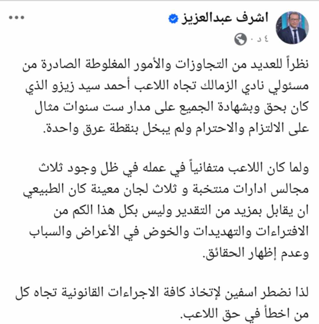 وكتب أشرف عبد العزيز في رسالته عبر فيس بوك، نظراً للعديد من التجاوزات والأمور المغلوطة الصادرة من مسئولي نادي الزمالك تجاه اللاعب أحمد سيد زيزو الذي كان بحق وبشهادة الجميع على مدار ست سنوات مثال على الالتزام والاحترام ولم يبخل بنقطة عرق واحدة.