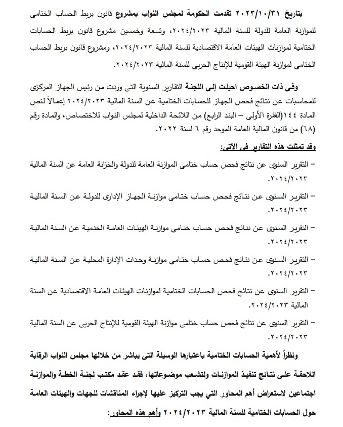 قالت اللجنة، في تقريرها، أنه بتاريخ ۲۰۲۳/۱۰/۳۱ تقدمت الحكومة لمجلس النواب بمشروع قانون بربط الحساب الختامي للموازنة العامة للدولة للسنة المالية ۲۰۲٤/۲۰۲۳ ، وتسعة وخمسين مشروع قانون بربط الحسابات الختامية لموازنات الهيئات العامة الاقتصادية للسنة المالية ۲۰۲/۲۰۲۳ ، ومشروع قانون بربط الحساب الختامي لموازنة الهيئة القومية للإنتاج الحربي للسنة المالية ٢٠٢٤/٢٠٢٣.