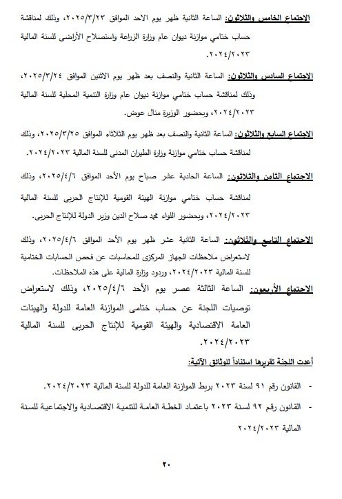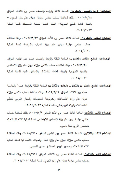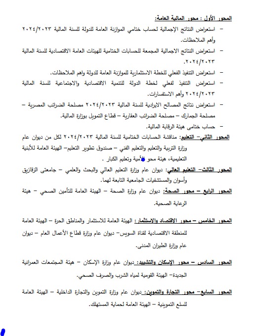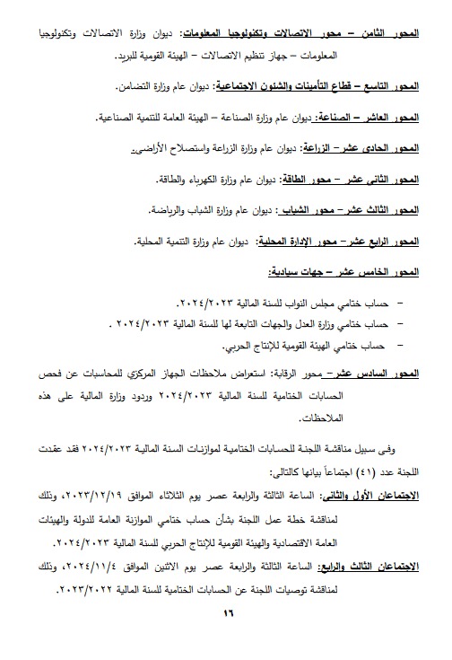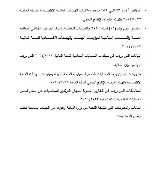 وفي ذات الخصوص احيلت إلى اللجنة التقارير السنوية التي وردت من رئيس الجهاز المركزي للمحاسبات عن نتائج فحص الجهاز للحسابات الختامية عن السنة المالية ٢٠٢٤/٢٠۲۳ إعمالاً لنص المادة ١٤٤ الفقرة الأولى - البند الرابع من اللائحة الداخلية لمجلس النواب للاختصاص، والمادة رقم (٦٨) من قانون المالية العامة الموحد رقم 6 لسنة ٢٠٢٢.