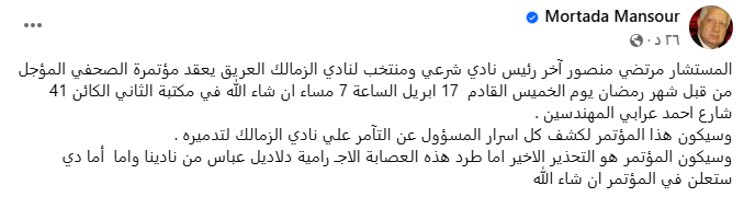 يعقد المستشار مرتضى منصور، المؤتمر الصحفي المؤجل من قبل شهر رمضان يوم الخميس القادم 17 ابريل الساعة 7 مساء إن شاء الله، في مكتبة الثاني الكائن 41 شارع احمد عرابي المهندسين.