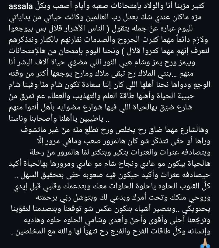 وتابعت أصالة حديثها موجهة رسالة لابنتها شام: كلّ القلوب الحلوه ياحلوة الحلوات معك وبتدعمك وقلبي قبل إيدي وروحي ملكك وتحت أمرك وبدعي لك وبتوسّل ربّي برحمته يحتويكي ..وبتصير أشياء بتكون عكس شو توقعنا وبتصدمنا لتقوّينا وترجًعنا أحلى وأقوى وأحنّ وأهدى وشامي الحلوه حلوه وهاديه وإنسانه وكلّ طاقات الفرح والفرج رح تتهيّأ لها والله مع المخلصين.