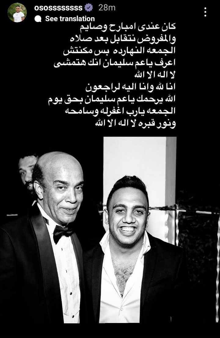 ونشر أوس أوس صورة له رفقة الفنان سليمان عيد على حسابه الرسمي بموقع تبادل الصور والفيديوهات انستجرام من خلال خاصية ستوري ورصدها موقع تحيا مصر وكتب عليها معلقا: "كان عندي امبارح وكان صايم والمفروض نتقابل بعد صلاة الجمعة النهاردة، بس مكنتش اعرف ياعم سليمان أنك هتمشي، لا اله الا الله وانا لله وانا اليه راجعون.. الله يرحمك يا عم سليمان بحق يوم الجمعة، يارب اغفر له وسامحه ونور قبره لا إله إلا الله.
