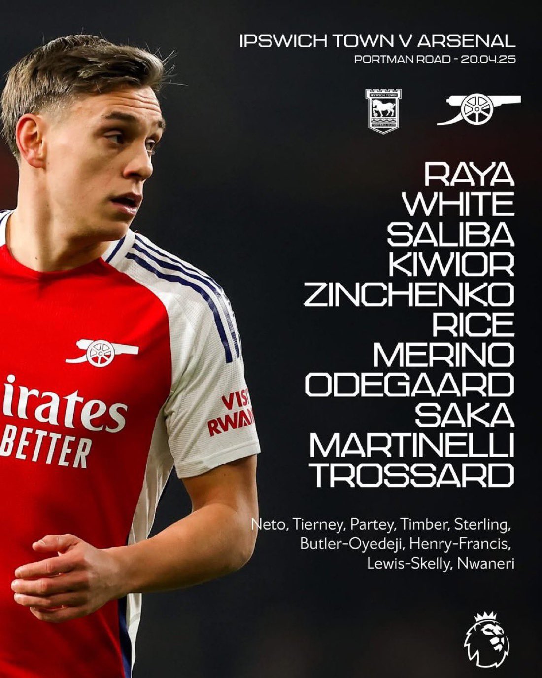 التشكيل الرسمي لمباراة أرسنال وإبسويتش تاون في الدوري الإنجليزي الممتاز