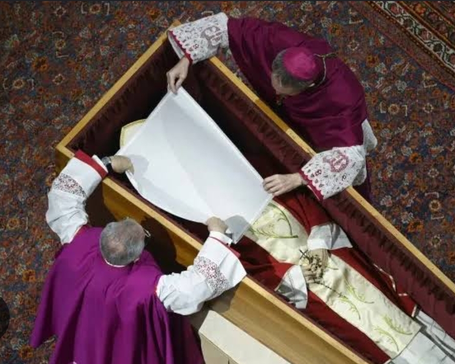 تاريخيًا، كان جثمان البابا المحنط يُوضع على نعش مرتفع في كاتدرائية القديس بطرس ليُعرض على الجمهور. فعند وفاة البابا يوحنا بولس الثاني عام 2005، وُضع جثمانه أولًا في قاعة كليمنتين المزخرفة باللوحات الجدارية لموظفي الفاتيكان، ثم نُقل إلى كاتدرائية القديس بطرس ليُعرض على الجمهور، لكن فرنسيس ألغى هذا التقليد بمراجعة طقوس الجنازة المُستخدمة في وفاته، مُبسّطًا إياها للتأكيد على دوره كأسقف فحسب، لكن جثمان فرانسيس سيُترك داخل نعش مفتوح الغطاء.