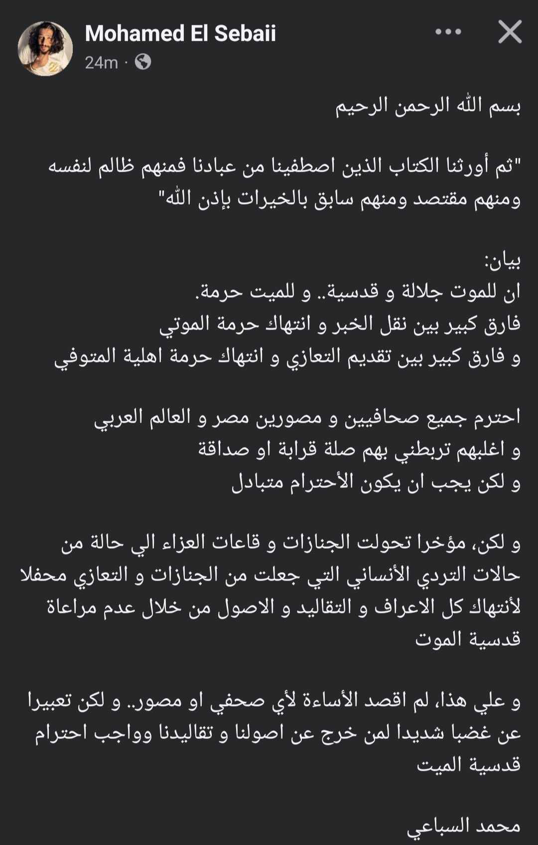 وتابع حديثه: ان للموت جلالة و قدسية.. و للميت حرمة، فارق كبير بين نقل الخبر و انتهاك حرمة الموتي و فارق كبير بين تقديم التعازي و انتهاك حرمة اهلية المتوفي، احترم جميع صحافيين و مصورين مصر و العالم العربي اغلبهم تربطني بهم صلة قرابة او صداقة ولكن يجب ان يكون الأحترام متبادل.