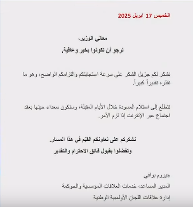 ووفقًا لمصادر، ردّت وزارة الرياضة على الخطاب الأول الذي أرسلته اللجنة الأولمبية الدولية يوم ١٠ أبريل الجاري، وعبرت الوزارة عن خالص شكرها وتقديرها للدور الذي تقوم به اللجنة الأولمبية الدولية للحفاظ على الميثاق الأولمبي، فيما لم ترسل الوزارة نسخة من التعديلات، وهو ما استدعى الأولمبية الدولية إلى إرسال الخطاب الثاني الذي أكد بوضوح على ضرورة إرسال نسخة من مسودة تعديلات القانون.