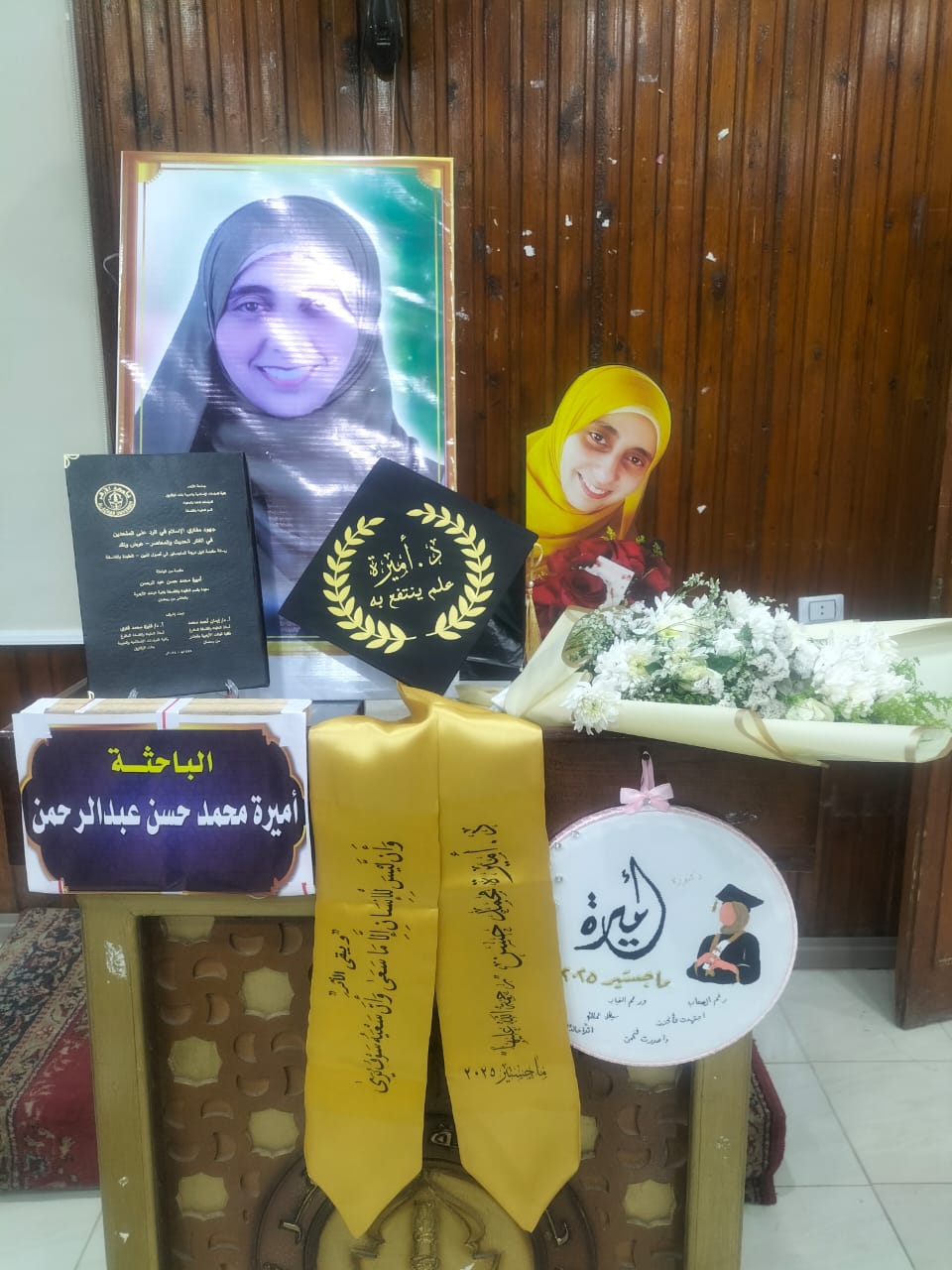 علمًا بأن الباحثة كانت قد أعدت الرسالة على مدار 4 سنوات، وتتابع مع لجنة الإشراف على الرغم من ظروفها المرضية وسيتم وضع اسم الباحثة على الكرسي المخصص لها، وستقوم لجنة الإشراف بالرد على لجنة المناقشة بدلًا من الباحثة حتى يتم استيفاء أركان المناقشة.