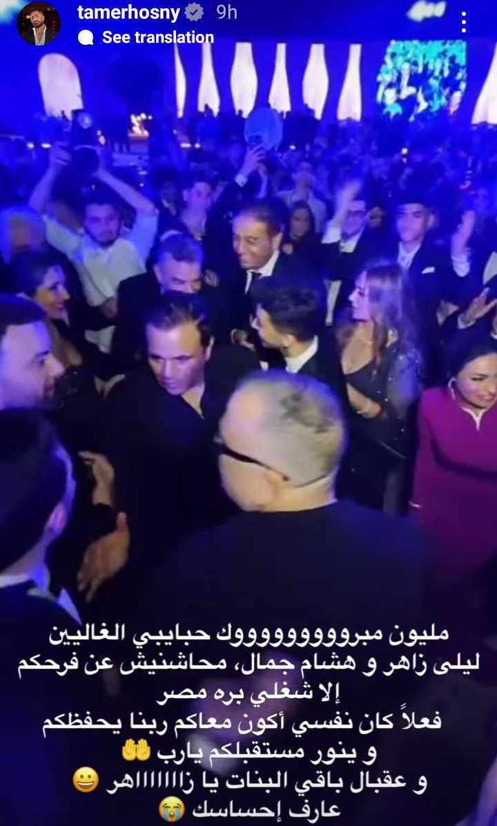 وكتب تامر حسني في منشور عبر خاصية ستوري بموقع تبادل الصور والفيديوهات انستجرام ورصده موقع تحيا مصر، مهنئا ليلى زاهر وهشام جمال بزفافهم وموضحا سبب غيابه عن حفل الزفاف: "مليون مبروك حبايبي الحلوين الغالين ليلى زاهر وهشام جمال، محاشنيش عن فرحكم إلا شغلي برة مصر، ربنا يحفظكم وينور مستقبلكم يارب، وعقبال باقي البنات يا زاهر عارف احساسك.