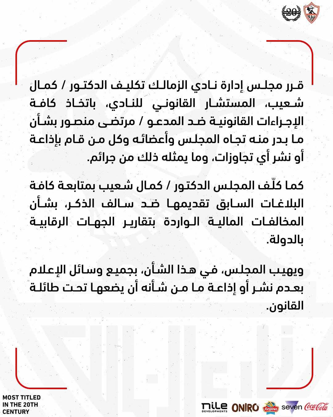 نادي الزمالك يكلف المستشار القانوني باتخاذ كافة الإجراءات القانونية ضد مرتضى منصور بشأن ما بدر تجاه المجلس وأعضائه